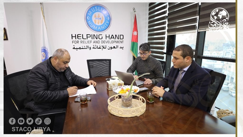 The Chairman of the Board of Directors of The Sheikh Tahir Al-Zzawi Charity Organization, Mr. Salem Al-Qamoudi, met with the Director of Programs and Operations for Emergency Response at the American Helping Hand Charity during a visit to his regional office located in the capital of the Hashemite Kingdom of Jordan, Amman.