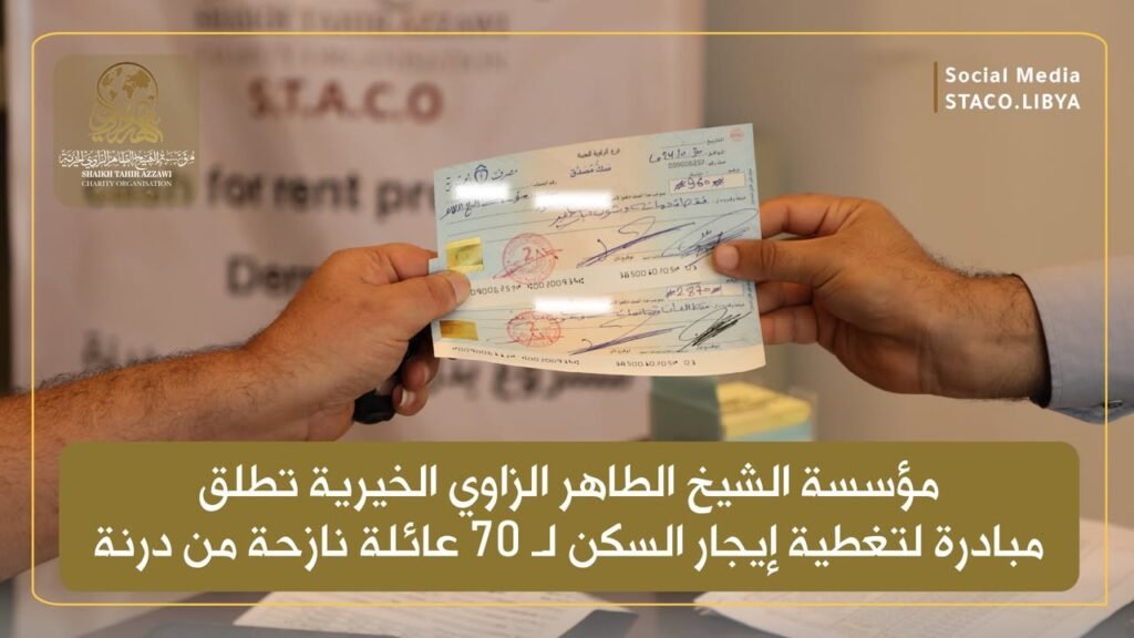 In a humanitarian step that reflects a deep commitment to supporting affected Libyan families, Sheikh Taher Al-Zawi Charity Foundation announced the launch of a new initiative aimed at providing direct financial support to cover the rent of housing for a period of up to six months for 70 displaced families from the city of Derna, which was exposed to the catastrophic effects of the moderate Daniel storm. This initiative aims to alleviate the burden of living conditions experienced by displaced families from the city of Derna.