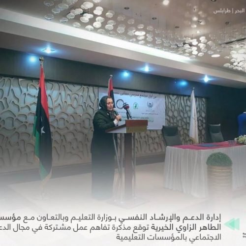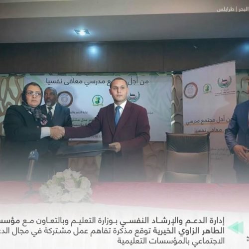 In a distinguished step, the Sheikh Al-Taher Al-Zawi Charitable Foundation, in partnership with the Department of Psychological Support and Guidance of the Ministry of Education, laid the foundation stone for building a good and sound youth imbued with the spirit of citizenship and the facts of peace in a healthy and cohesive society and with a strong social fabric, by providing psychological and social support to our children within educational institutions, where the Foundation signed Sheikh Al-Taher Al-Zawi Charity / STACO and the Psychological Support Department at the Ministry of Education, a memorandum of understanding for joint work in establishing projects related to the field of psychological support within educational institutions in various parts of Libya.