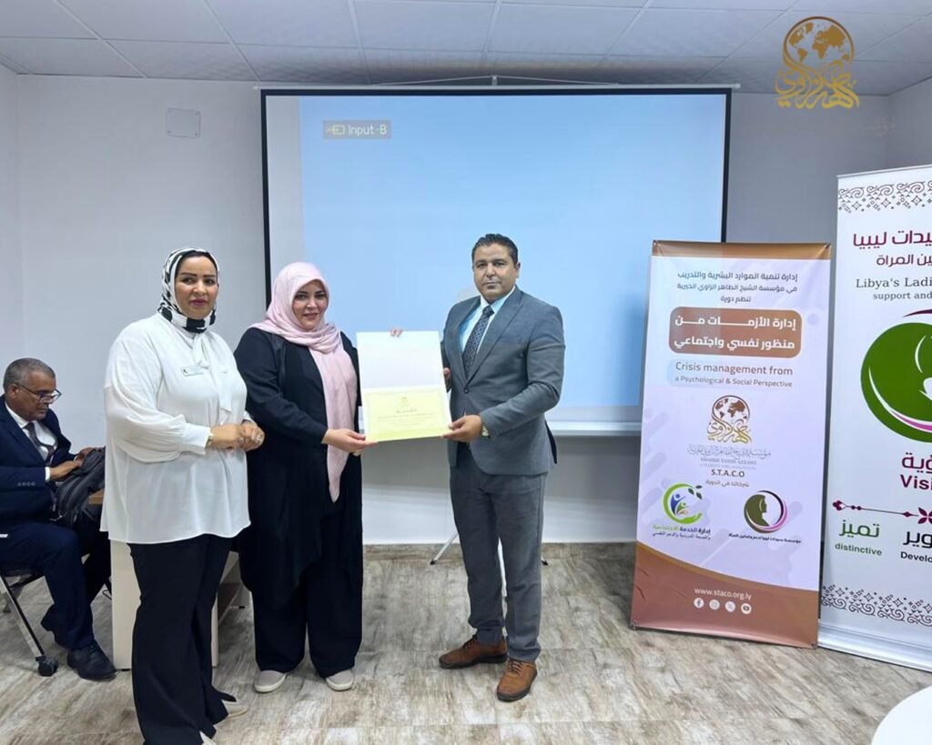 The Human Resources Development and Training Department at Sheikh Al-Taher Al-Zawi Charitable Foundation, in cooperation with the Department of Social Service, School Health, and Psychological Support at the Ministry of Education, and the Libyan Women’s Foundation for Support and Empowerment, concluded the training course entitled “Crisis Management from a Psycho-Social Perspective”, as part of the Women and Peace Campaign activities.