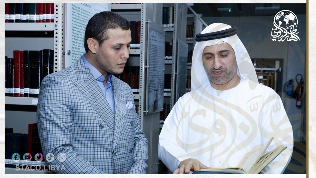 The Chairman of the Board of Directors, with those responsible for the Center, toured the libraries and publications, and learned about the process of preserving books and electronic archiving, stressing the necessity of benefiting from this scientific experience in the fields of scientific research in Libya, while the Director General of the Center, and the necessity of cooperation, coordination, and exchange of publications between the Center, and Sheikh Tahir Al-Zzawi charity organization.