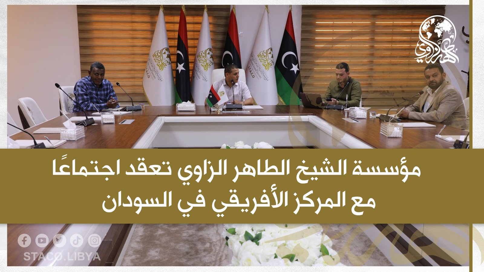 The Chairman of the Board of Directors of the Sheikh Tahir Al-Zzawi organization, Salem Al-Qammoudi, held a meeting at the organization’s headquarters in Tripoli with the president of the Sudanese community and with the participation of the President of the African Center in Sudan via Zoom, in the presence of the Program Director and the Organization’s Sudan File Officer.