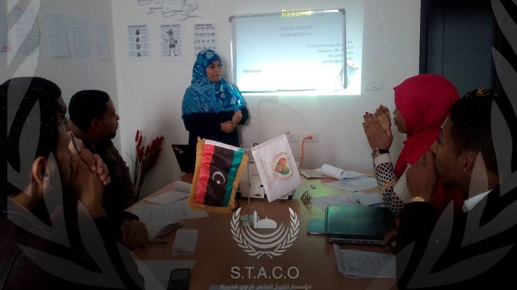 Continuing training workshops at Sheikh Al-Taher Al-Zawi Charitable Foundation. The Foundation’s office in Sebha organized a workshop on writing a CV and written application in English for the Foundation’s employees..Under the supervision of Professor: Hana Al-Shami.